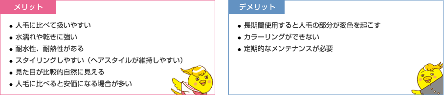 「人毛」が持つ自然さ、「人工毛」が持つ扱いやすさなど、それぞれのメリットや価格面でのバランスを考慮したタイプです。