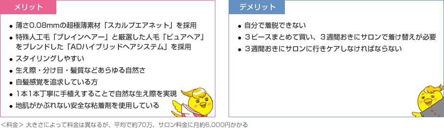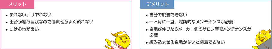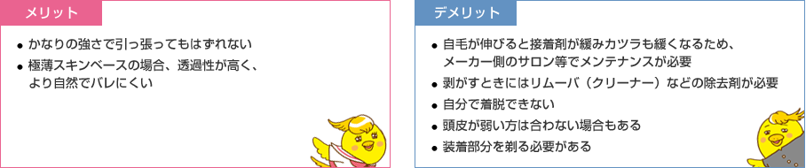 基本的には「接着式かつら」と同様、人工毛や人毛を植え付けたベースの部分を、頭皮に貼り付けて固定する方式ですが、注目する部分は髪を植え付けるベースの"強度"と"薄さ"です。